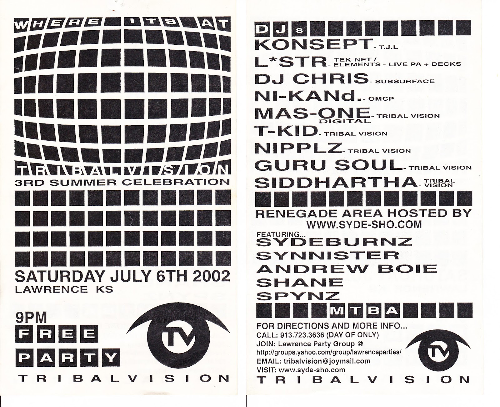 Main Stage: Konsept - TJL, L*Str - TekNet, Elements - Live PA & Decks, DJ Christ - Subsurface, NI-KanD - OMCP, Mas-One - Tribal Vision, T-Kid - Tribal Vision, Nipplz - Tribal Vision, Guru Soul - Tribal Vision, Siddhartha - Tribal Vision