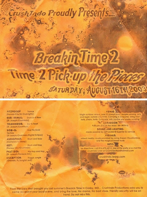 It was time to "pick up the pieces," and that is exactly what Kourtney did, picking up the slack for Todd and making her way out to the St Joseph area for a little rave in the field featuring Orlando Junglist Deception, along with support from Phat Boi, Subliminal, Telekinesis and Bob-O out of St Joseph, and Fitzroger and 627 from KC.