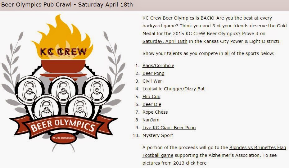 Sports of the sort of Bag/Cornhole, Beer Pong, Civil War, Dizzy Bat, Flip Cup, Beer Die, Rope Chess, CanJam and Giant Beer Pong challenged players multiple brackets  Proceeds were set to go to the Blondes vs Brunettes Flag Football game supporting the Alzheimer's Association - Heart of America Chapter.
